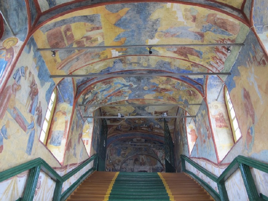 Интерьер западной паперти. Страшный Суд фрагмент фрески. Западная стена храмовой части собор с завидным мастерством расположив ее вокруг окна. Вверху над окном и по сторонам его он поместил сцену «Церковь, молящаяся Христу» и приемлющая от него «велию благодать» выделив ее центр - Церковь пред Христом - и опустив боковые звенья композиции по сторонам окна.